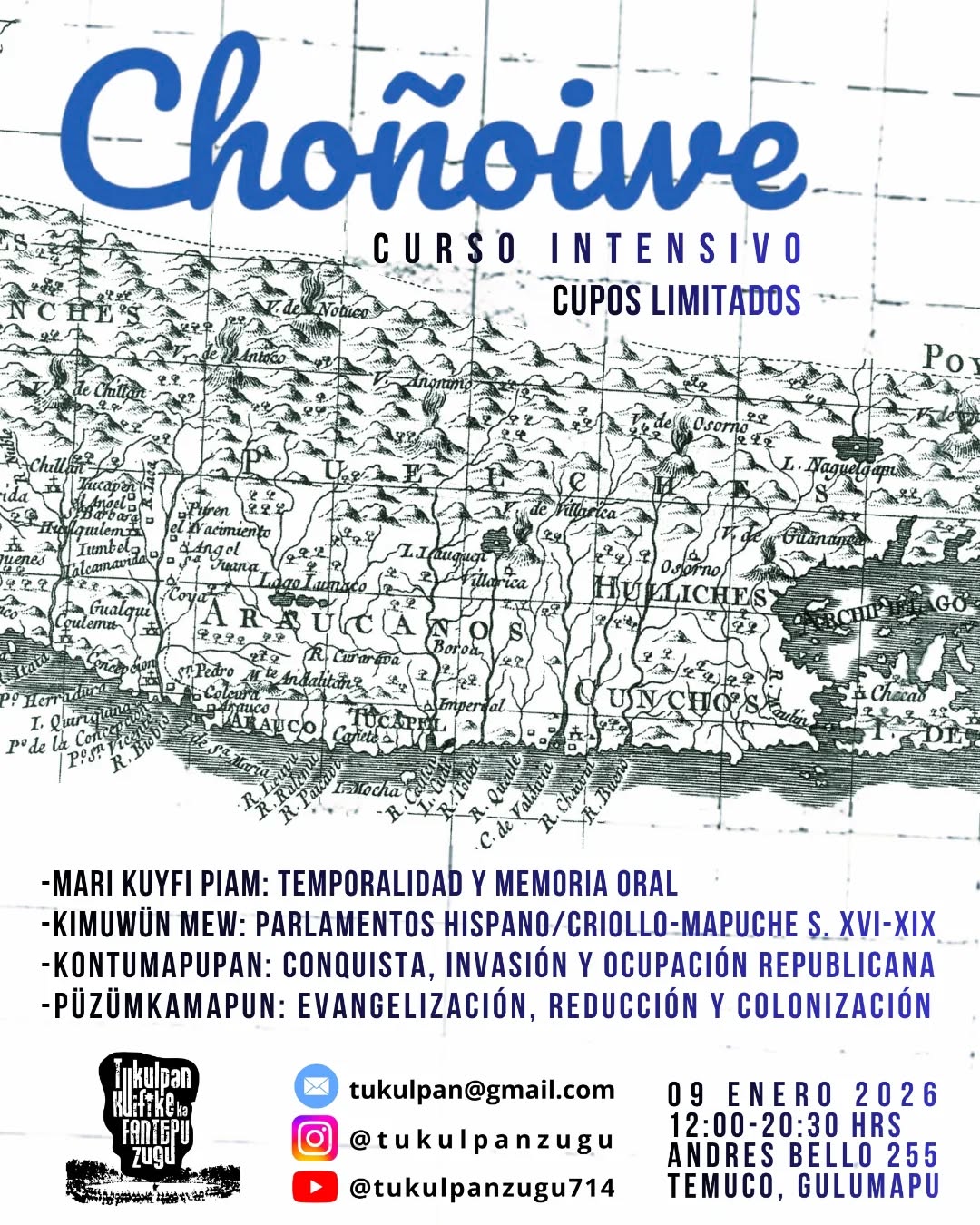 Se dictará curso intensivo de historia y memoria mapuche: Choñoiwe, en Temuco 30 / Dic / 2025 Tukulpanzugun ni elzungu kimeltuwun zungu meu. El programa Choñoiwe tiene como propósito contribuir a la enseñanza de la historia y memoria con enfoque mapunche, destinado a toda persona habitante de Wallmapu interesada. La iniciativa se adscribe a la revitalización lingüística, así como una acción propositiva para la autonomía educativa en y para Wallmapu. Presentación de […]
