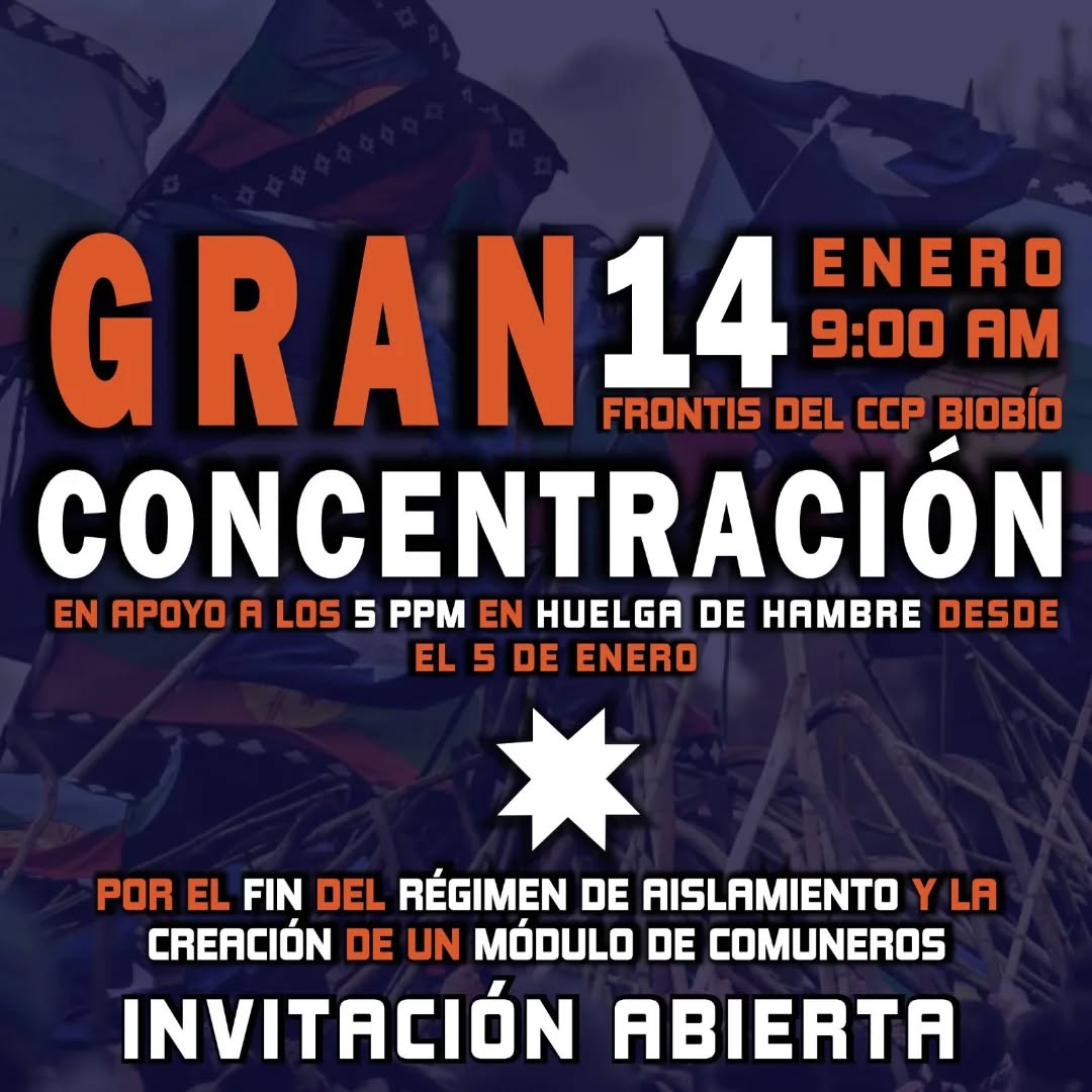 Se realizará concentración en apoyo a los 5 PPM en huelga de hambre en el CCP Bíobío 12 / Ene / 2026 Los familiares de los prisioneros políticos mapuche recluidos en el módulo de máxima seguridad del CP Bío Bío y que desde el 5 de enero se encuentran en huelga de hambre, hacen un llamado y extendiden una invitación a los distintos lov y comunidades mapuche y a la opinión pública en general, para reunirse en […]