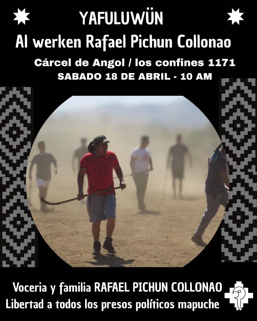 Convocatoria a Yafuluwün en apoyo al werken y preso político mapuche Rafael Pichun Collonao en Angol 15 / Abr / 2026 «Mari mari kom pu lamgien. Yafuluwün en apoyo al werken y preso político mapuche Rafael Pichun Collonao a las afueras de la cárcel de Angol para acompañar y apoyar al werken tras ser ratificada su condena por la corte suprema a 7 años de cárcel. Hacemos un llamado pu che a acompañar al werken y […]