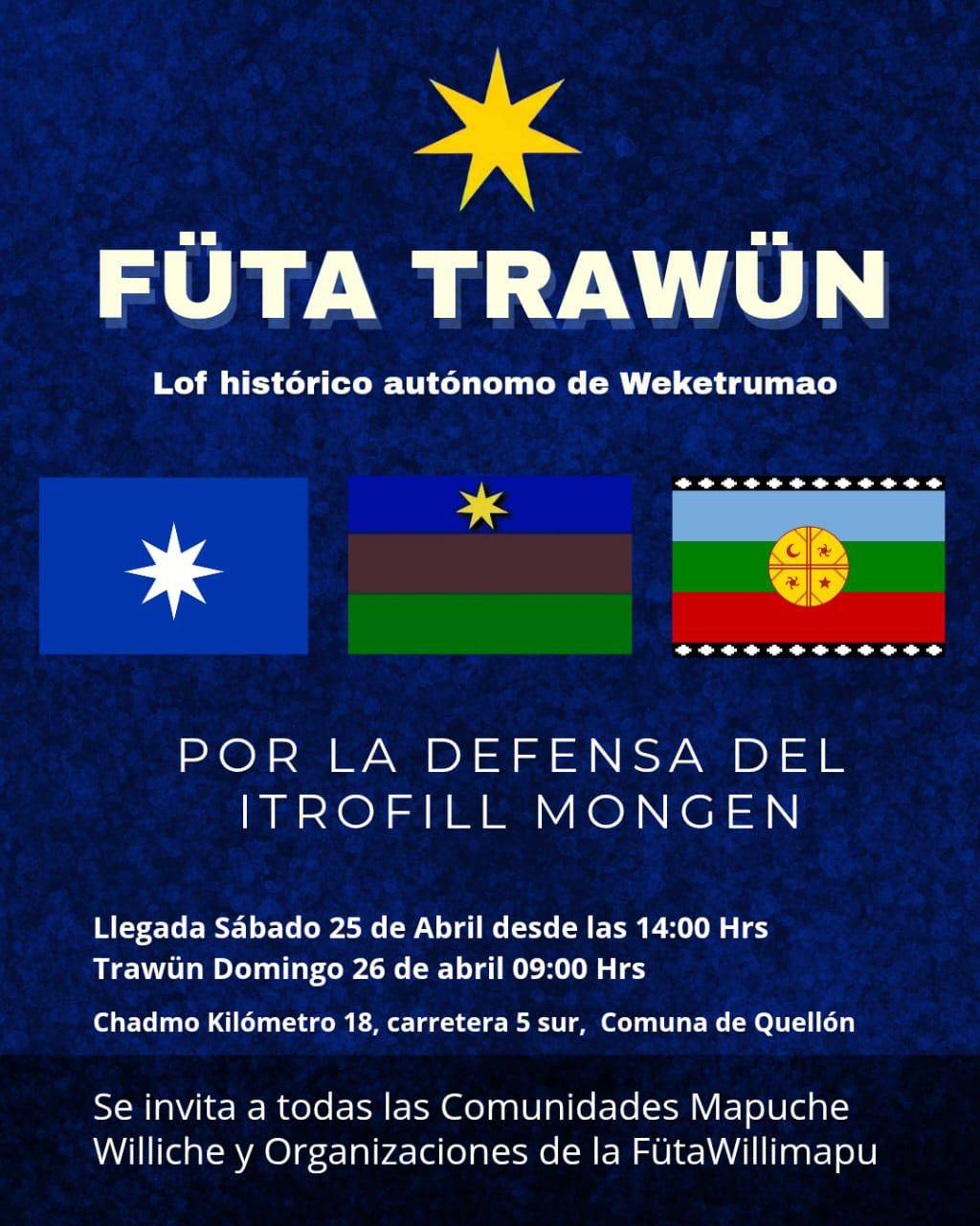 Se realizará Nütramkawün: Inkayaiñ taiñ Lafken Mapu, hablemos sobre la Ley Lafkenche, en Temuco 6 / Abr / 2026 «Mari mari kom eymün! Les extendemos esta invitación para el día míercoles 8 de abril desde las 17:30 horas en nuestra ruka. Durante largos años el lafken mapu se ha encontrado indefenso ante las empresas salmoneras transnacionales que no solo contaminan el lafken, sino que difaman y perjudican a todas las comunidades mapuche lafkenche. Es […]