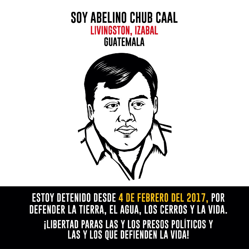Abelino Chub Caal es un profesor y promotor de derechos humanos que está preso desde el 4 de febrero del 2017, estando por mar de 540 días preso de manera arbitraria e irregular, por delitos que él no cometió. El Ministerio Público ha pedido el sobreseimiento del caso y el Juez Anibal Arteaga López se ha negado a desestimar el caso y ha negado el derecho a la presunción de inocencia.