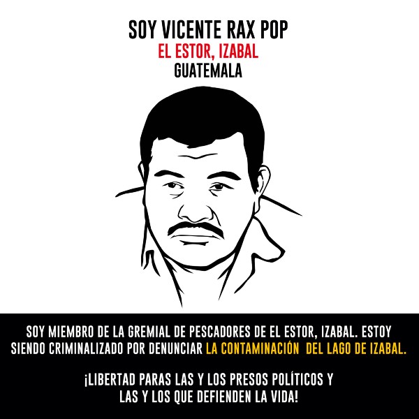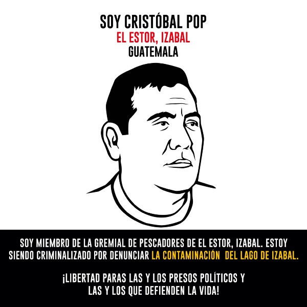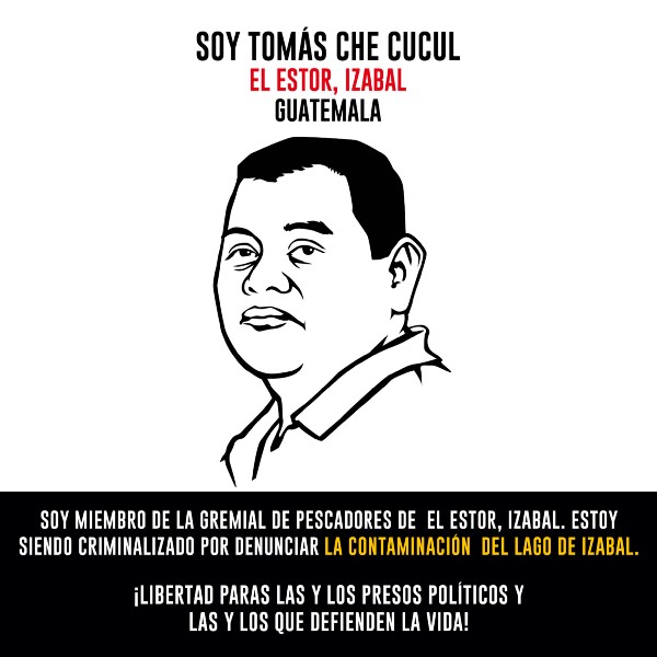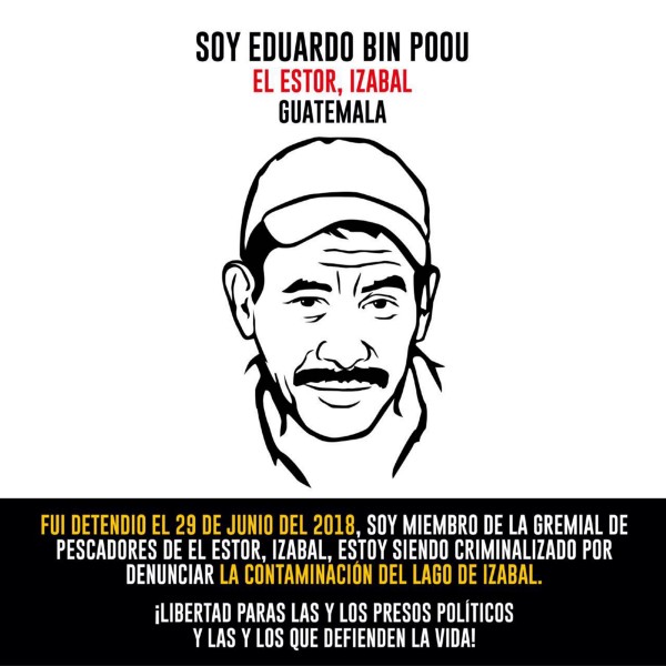 Cristobal Pop,Vicente Rax Pop, Eduardo Bin Poou, Juan Eduardo Caal Suram, Tomas Che Cucul, Marco Tulio Cuc defensores de derechos humanos y miembros de la gremial de pescadores de El Estor Izabal, criminalizados por denunciar la contaminación del lago de Izabal, por la empresa extractora de níquel (CGN-PRONICO) quienes el 27 de mayo del 2017 salieron a manifestar contra la empresa minera y fueron reprimidos y criminalizados dejando el saldo de un pescador fallecido Carlos Maaz y lo hechos ocrurridos ese día dejaron una lista larga de personas con orden de captura.
