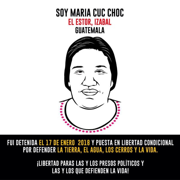 Maria Magdalena Cuc Choc es maestra bilingüe que ha trabajado como traductora en procesos penales por parte del sistema de justicia, ha acompañado y denunciando los desalojos violentos en el área del valle del Polochic y El Estor, estuvo presa del 17 al 19 de enero del 2018 y su proceso continua, así mismo tiene la prohibición de abandonar el departamento de Izabal y tuvo que pagar una fianza muy alta para poder salir con una medida sustitutiva.