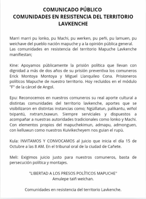 Las comunidades en resistencia del territorio Mapuche Lavkenche manifiestan: