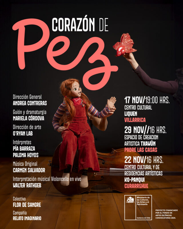 La colectiva Flor de Sangre, de Pucón, en colaboración con la compañía Relato Imaginario, presenta su nuevo montaje teatral “Corazón de pez”, una propuesta escénica que marca el inicio de una circulación por cuatro comunas de la Región de La Araucanía. El estreno se realizará el lunes 17 de noviembre en el Centro Cultural Liquen de Villarrica, dando inicio a una itinerancia que visitará Curarrehue, Temuco y Padre Las Casas.
