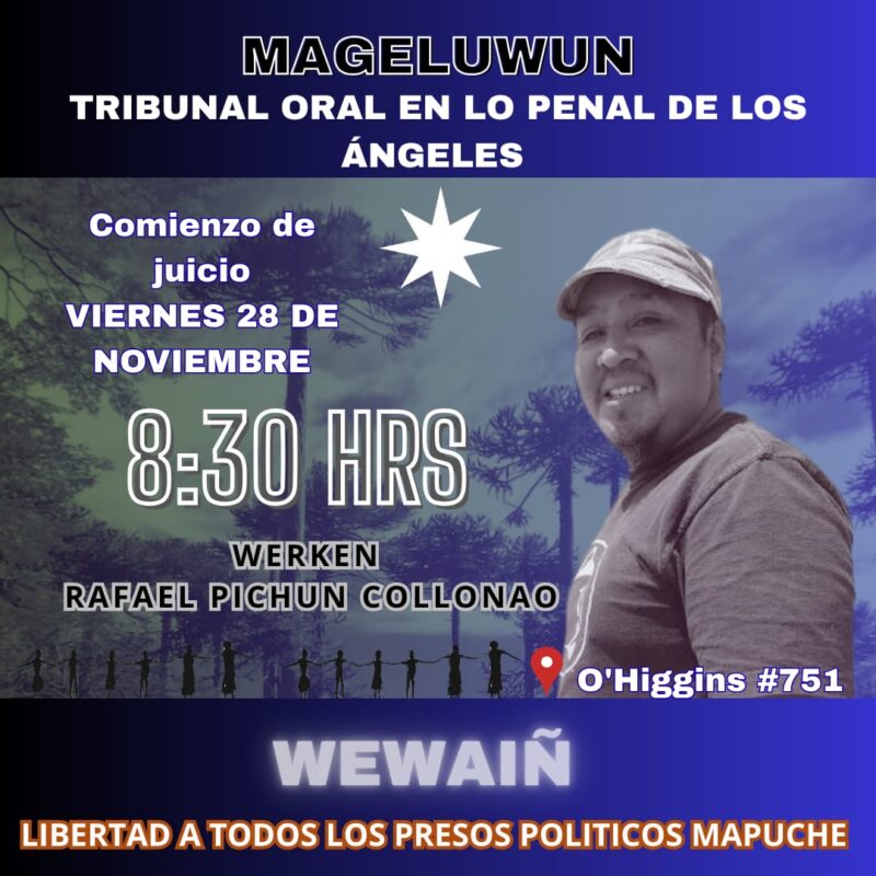 Por otra parte, este viernes 28 de noviembre se dará inicio al juicio en contra el werken Rafael Pichun en el Tribunal Oral en lo Penal de Los Ángeles, en el que se le acusa de ser el supuesto autor intelectual de un ataque incendiario a una faena forestal en Los Ángeles, región del Biobío, por lo que se ha convocado a un Magelewun para acompañar al werken desde las 8:30 hrs de la mañana, en el tribunal Oral en lo Penal de Los Ángeles, ubicado en O’Higgins #751.