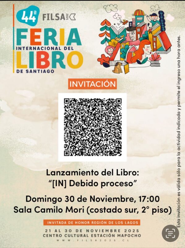 Este año la 44ª Feria Internacional del Libro de Santiago llega con la Región de Los Lagos como invitada de honor, aproximando la literatura del sur a la gran ciudad, del 21 al 30. En ese marco se presentará por primera vez en Santiago el libro “[IN]Debido Proceso. Persecución penal en el Wallmapu”, comentado por la Dra. en derecho Myrna Villegas, junto a sus autores Karina Riquelme, Sebastián Saavedra y Pablo Ortega y su editor general, el Dr. en antropología e historiador Martín Correa. La actividad cuenta con la presentación musical de la cantautora mapuche Daniela Millaleo.