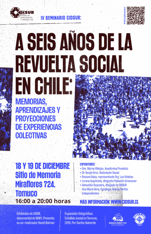 En tiempos en que la disputa por el sentido de la protesta se intensifica, el Centro de Investigación y Defensa Sur, invitaal IV Seminario “A seis años de la Revuelta Social en Chile: memorias, aprendizajes y proyecciones de experiencias colectivas”. Jueves 18 de diciembre, de 16:00 a 20:00 horas y viernes 19 de diciembre de 17:00 a 20:00 horas en el Sitio de Memoria Miraflores 724, Temuco. En vivo por Abajo’ e la línea TV.