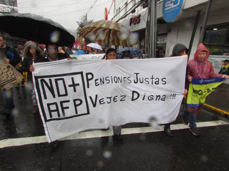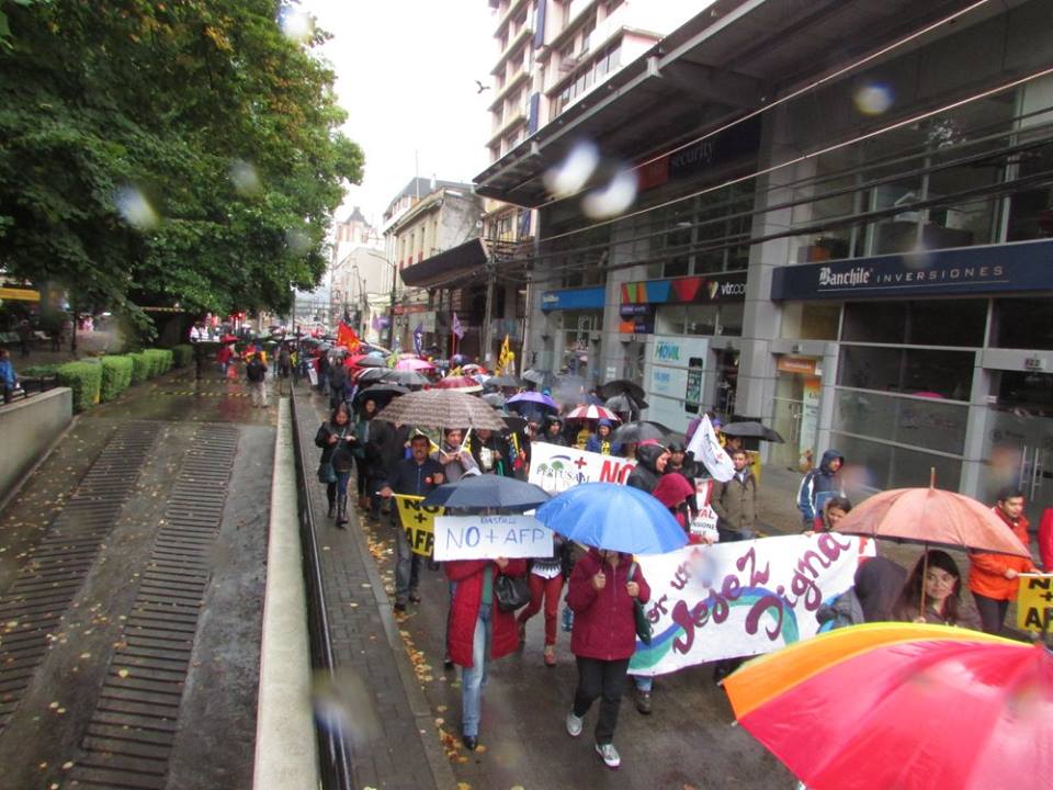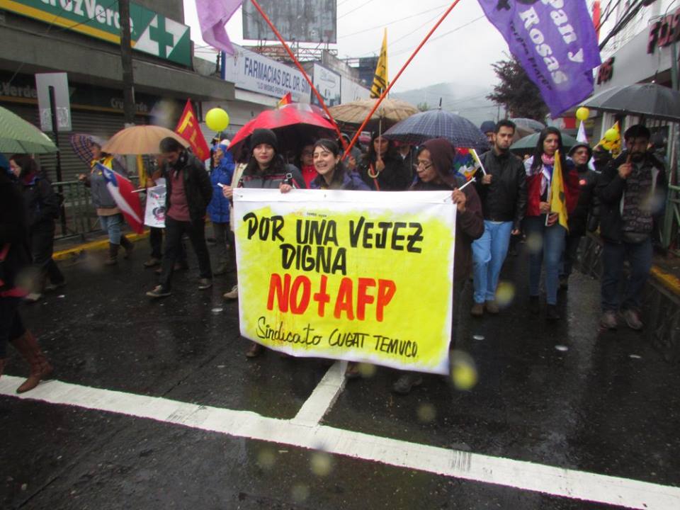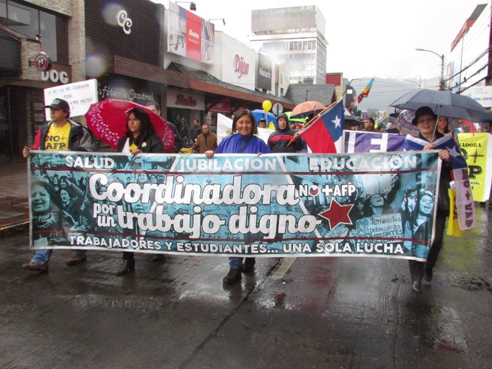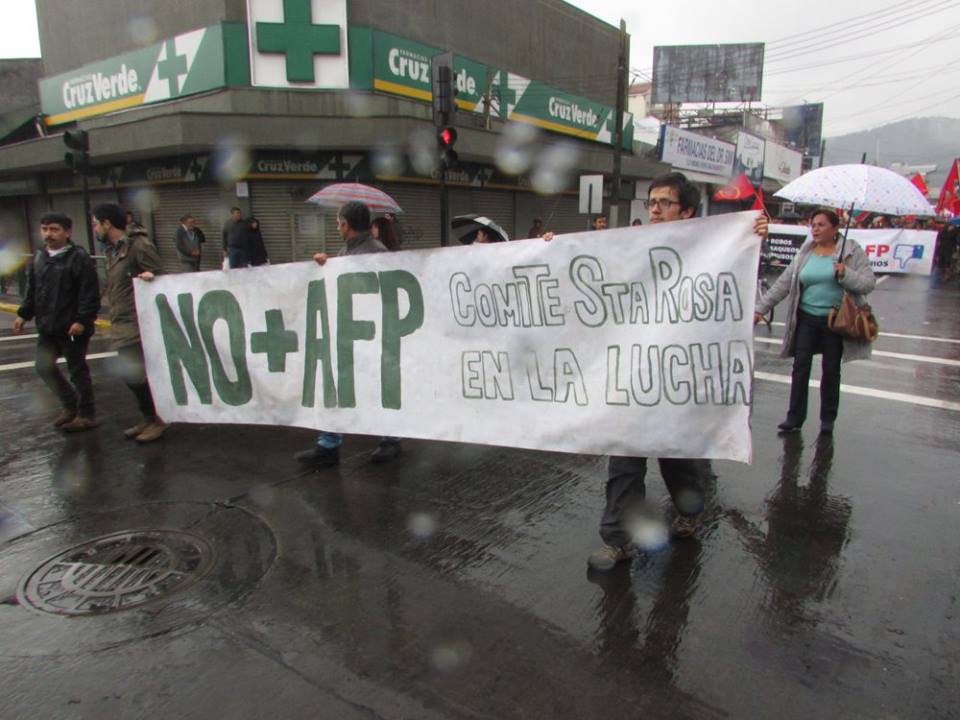 La coordinadora NO+AFP convocó a todos los sectores sociales en todos los rincones del territorio dominado por el estado de $hile a movilizarse en contra del sistema de capitalización individual privado; en lugar se propone por parte de las organizaciones un sistema de reparto solidario donde el aporte sea mixto (empleador, trabajador y estado) hasta los 65 años de edad en los hombres y hasta los 60 años de edad en las mujeres, ni un año más como pretenden desde la asociación de afp’s reformar y aumentar un 5% el aporte sin dejar de manifiesto quien costeará ese 5%. Dentro de las voces se dejó en claro que no se puede permitir que esta demanda justa y digna la capitalicen las afp’s, el llamado es a movilizarse, agitar, debatir en los lugares de empleo y preparar motores para un próximo paro nacional por la abolición de las afp´s y la puesta en marcha del proyecto de reparto solidario.