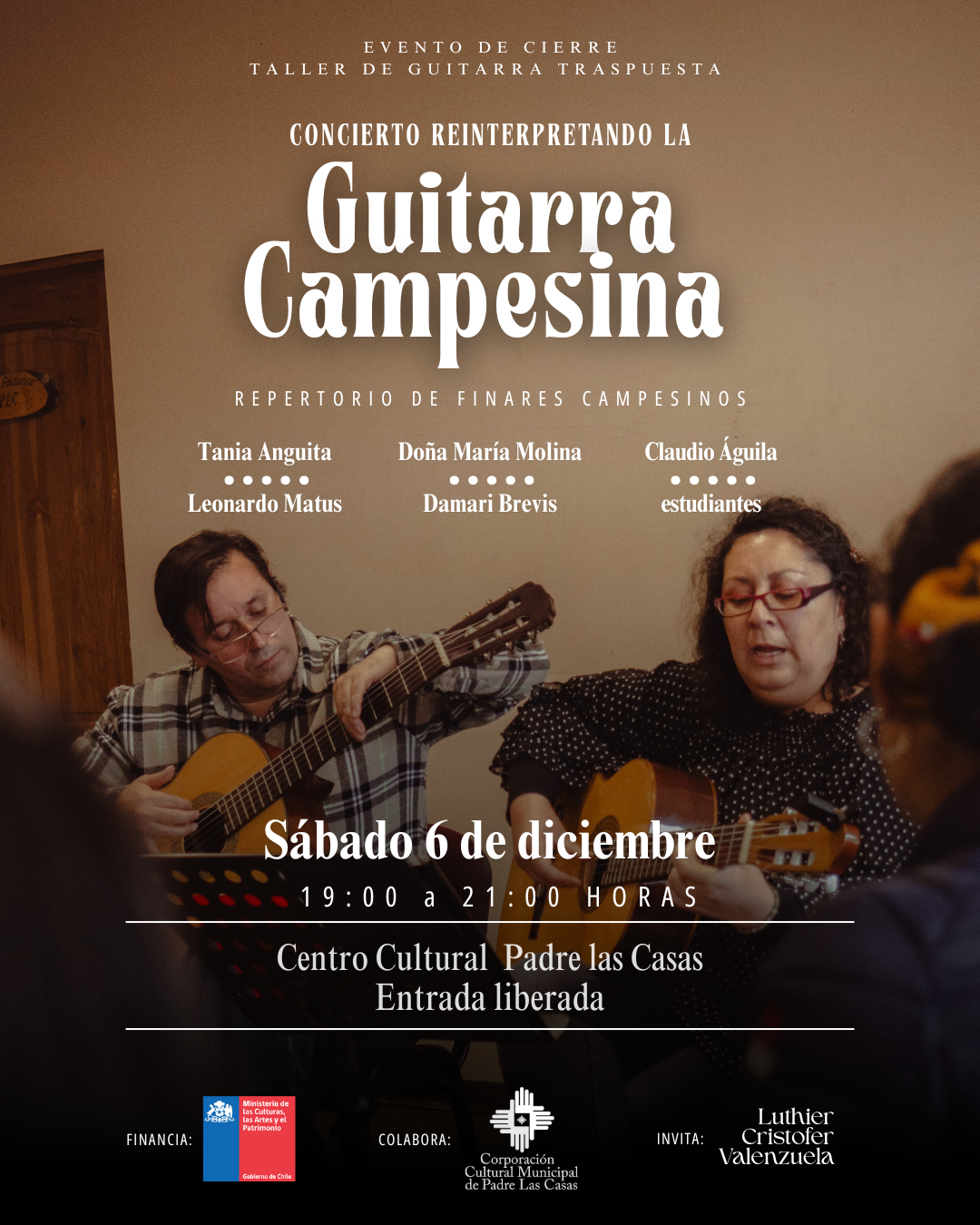 La melancolía y sus finares resonarán en el Concierto Reinterpretando la Guitarra campesina en el Centro Cultural de Padre las Casas 5 / Dic / 2025 Una veintena de guitarras en escena, entre cultoras, investigadoras, folkloristas, guitarristas y estudiantes invitan al “Concierto Reinterpretando la Guitarra campesina” en el Centro Cultural de Padre las Casas. Sábado 6 de diciembre, 19:00 a 21:00 horas, con el cierre del proyecto “Reinterpretando la guitarra campesina en La Araucanía: Un estudio exploratorio de las guitarras de […]