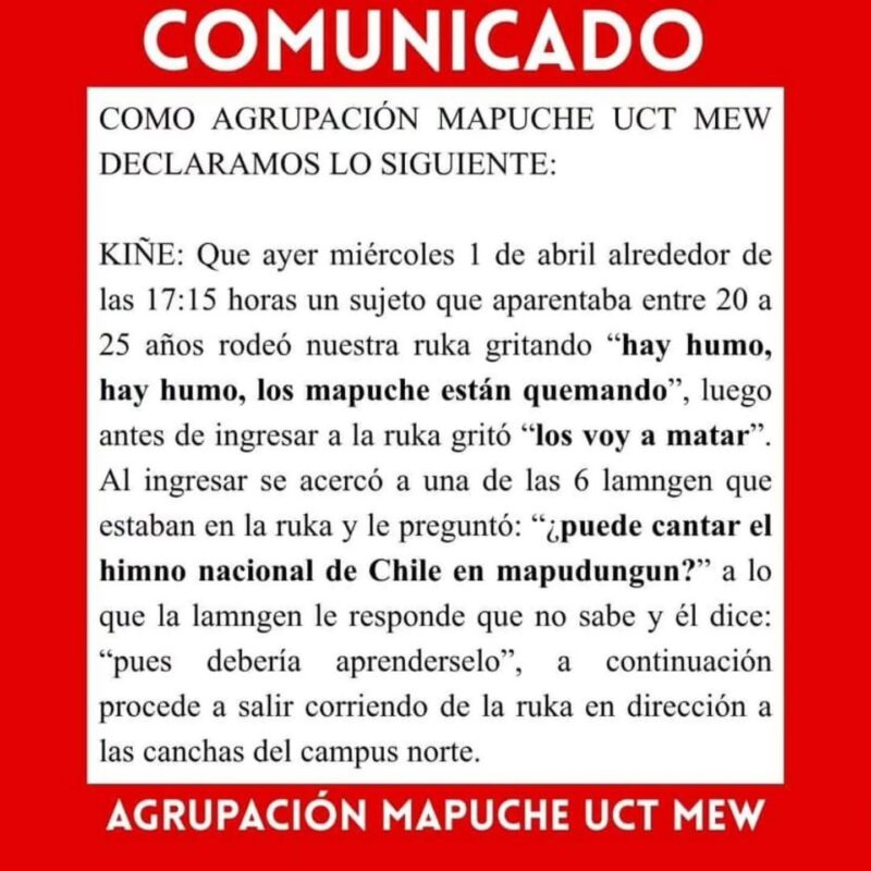KIÑE: Que ayer miércoles 1 de abril alrededor de las 17:15 horas un sujeto que aparentaba entre 20 a 25 años rodeó nuestra ruka gritando «hay humo, hay humo, los mapuche están quemando», luego antes de ingresar a la ruka gritó los voy a matar».