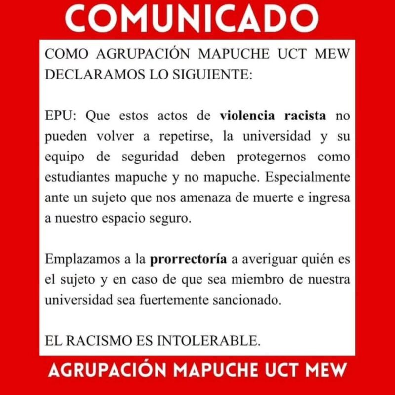 EPU: Que estos actos de violencia racista no pueden volver a repetirse, la universidad y su equipo de seguridad deben protegernos como estudiantes mapuche y no mapuche. Especialmente ante un sujeto que nos amenaza de muerte e ingresa