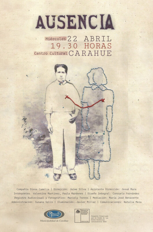 El próximo miércoles 22 de abril a las 19:30 horas, en el Centro Cultural de Carahue, la compañía Diosa Camelia presentará el estreno de «Ausencia», una propuesta escénica interdisciplinaria que aborda la muerte y los procesos de duelo desde una mirada íntima. La función marca el inicio de una circulación territorial que también contempla presentaciones en las comunas de Toltén y Perquenco.