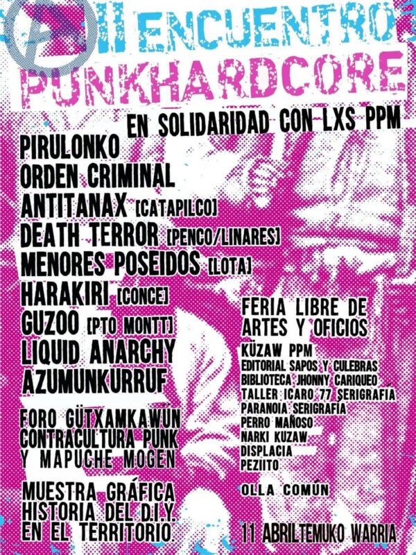 Pirulonko, Orden criminal, Antitanax, Death terror, Menores poseídos, Harakiri, Guzoo, Liquid anarchy, Azumunkurruf + Foro Gütxamkawün, «Contra cultura Punk y Mapuche Mogen» + Muestra gráfica historia del D.I.Y. en el territorio + Feria libre de artes y oficios + Olla común.
