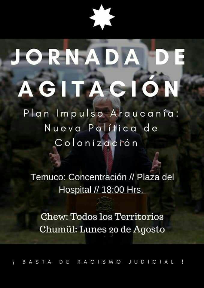 Convocan a una gran jornada de manifestación en todos los territorios en rechazo a los planes de gobierno, la represión encarnada en las últimas acciones del comando jungla y casos de condenas en contra de presos políticos mapuche. Además enfatizando en apoyar la huelga de hambre que llevan adelante los hermanos Pablo y Benito Trangol, a quienes recientemente se les rechazó recurso que buscaba la anulación del fallo.