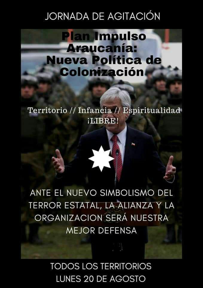 «En el último tiempo se ha observado un fortalecimiento del aparato represor estatal, materializado en maniobras exageradas como el comando jungla con sus múltiples allanamientos y el próximo lanzamiento del Plan Impulso Araucanía, entre muchos otros elementos que claramente forman parte de una mecánica interna que busca continuar con las prácticas históricas de despojo y colonización hacia el pueblo mapuche.