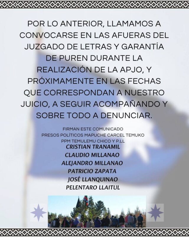 Por lo anterior, llamamos a convocarse en las afueras del juzgado de letras y garantía de Purén durante la realización de la APJO, y próximamente en las fechas que correspondan a nuestro juicio, a seguir acompañando y sobre todo a denunciar.