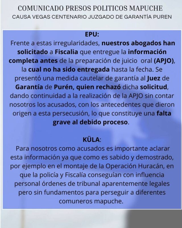 “COMUNICADO PRESOS POLITIC0S MAPUCHE CAUSA VEGAS CENTENARIO JUZGADO DE GARANTÍA PUREN