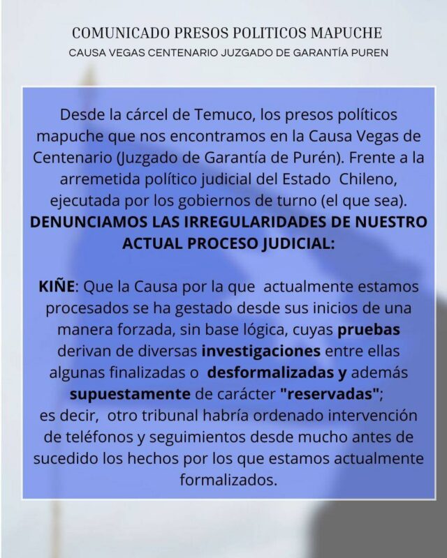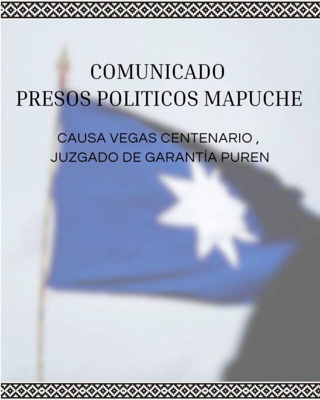 Desde la cárcel de Temuco, los presos políticos mapuche que nos encontramos en la Causa Vegas de Centenario (Juzgado de Garantía de Purén). Frente a la arremetida político judicial del Estado Chileno, ejecutada por los gobiernos de turno (el que sea).