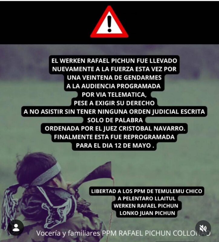 KIÑE: Informamos a los distintos territorios en proceso de lucha y resistencias que siguen llevando adelante en concreto el real control territorial de las tierras recuperadas. El werken Rafael Pichun Collonao, werken del Lof Temulemu -territorio nagche Traiguén- enfrenta un nuevo proceso judicial denominado Caso Centenario, Dónde está siendo acusado por reinvindicacion territorial entre otros delitos . Sumando a esto, el werken ya fue condenado a 7 años de carcel en conjunto a 5 pu peñi más, donde todos fueron condenados a duras condenas, Entre 15 y 17 años, evidenciando a una notoria intencionalidad de frenar los distintos procesos de reconstrucción del Wallmapu. Es así que el pasado 3 de marzo del año en curso, Nuevamente le tocó enfrentar un nuevo proceso judicial en la comuna de Puren junto al lonko Juan Pichun , además de integrantes del Lof Temulemu Chico Y Pelantaro Llaitul.