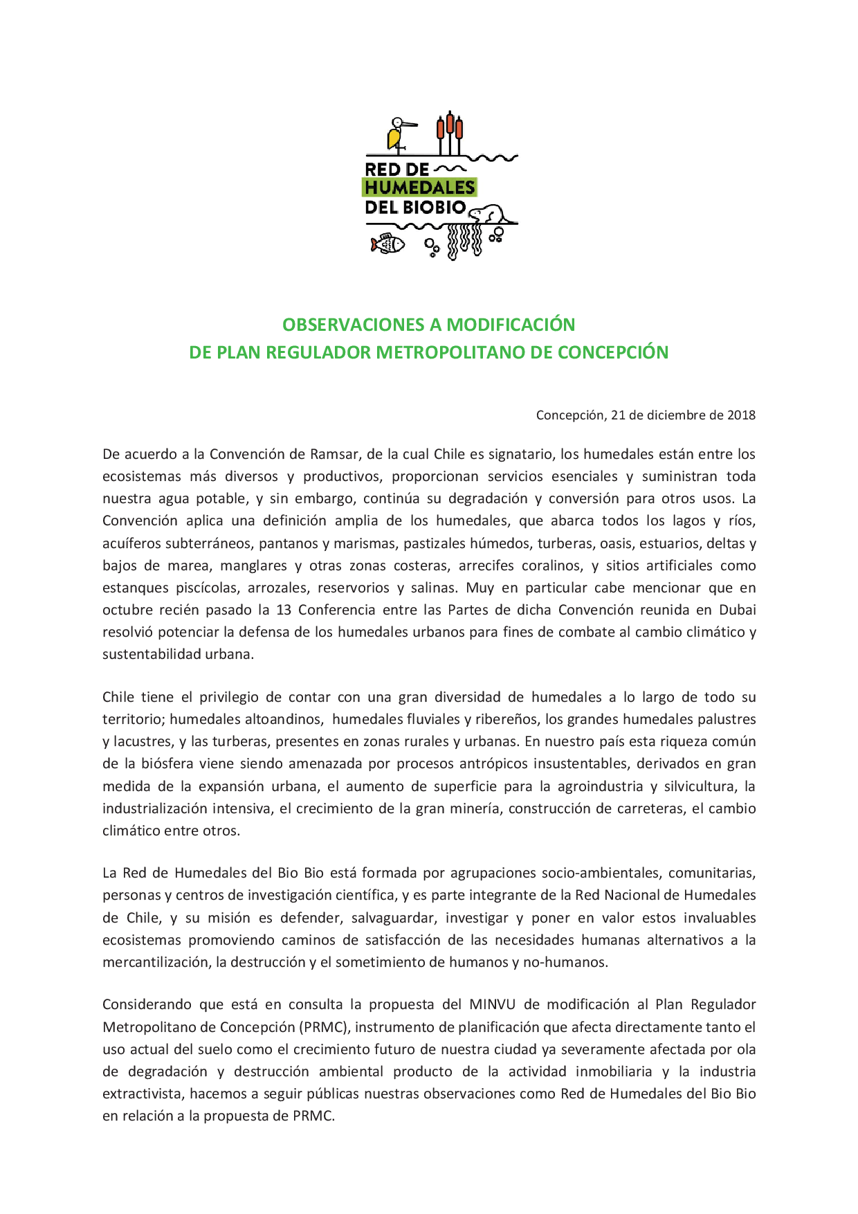 Es por lo anterior, que las organizaciones que dan vida a la Red de Humedales del Bío-Bío, han generado sus observaciones al proceso y se las han enviado a las instituciones correspondientes. A continuación, puedes leer íntegramente el documento ingresado hoy en la Seremi del Minvu:
