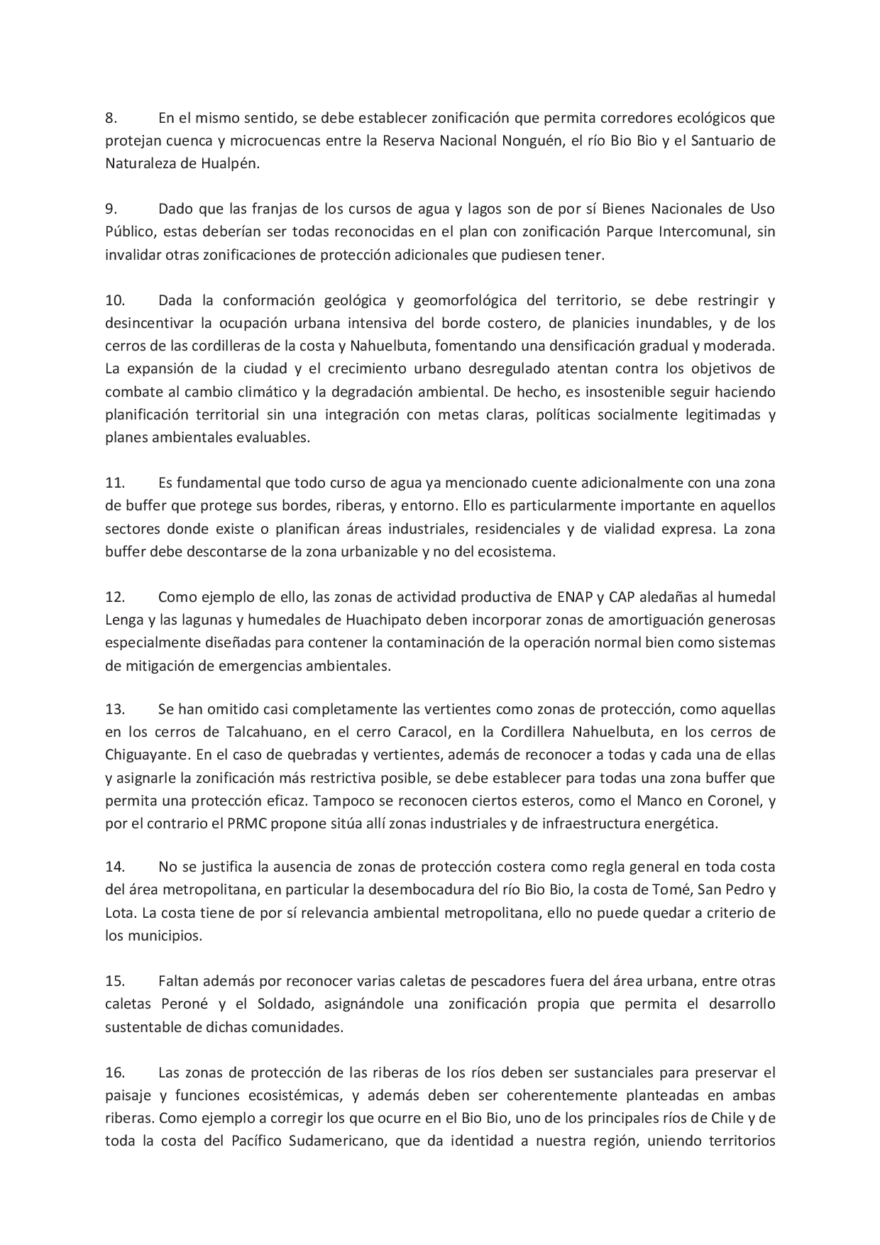 En la Región del Bío-Bío, la principal conurbación se conoce como Gran Concepción o Área Metropolitana de Concepción, y está compuesta por las comunas de Concepción, Talcahuano, Lota, Coronel, San Pedro de la Paz, Santa Juana, Hualqui, Tomé, Penco, Chiguayante y Hualpén. Este extenso territorio se encuentra en un proceso trascendental de planificación urbana como es el proyecto de modificación del Plan Regulador Metropolitano. El cual es desarrollado por el MINVU y se encuentra actualmente en proceso de consulta ciudadana, aunque no vinculante, y ha sido denunciado por diversas organizaciones ecologistas y territoriales como una amenaza para el medio ambiente y la calidad de vida en la zona. Los grupos han analizado los mapas disponibles en el sitio web dispuesto por el ministerio y han podido constatar que diversas áreas silvestres del Gran Concepción están amenazadas por el proyecto de modificación al plan regulador de la ciudad, que propone expandir en un 80% la superficie urbana en los próximos años y lo hace ocupando sus principales áreas naturales, entre ellas los diversos humedales de la zona, nichos de biodiversidad y puntos clave en el equilibrio ecosistémico.