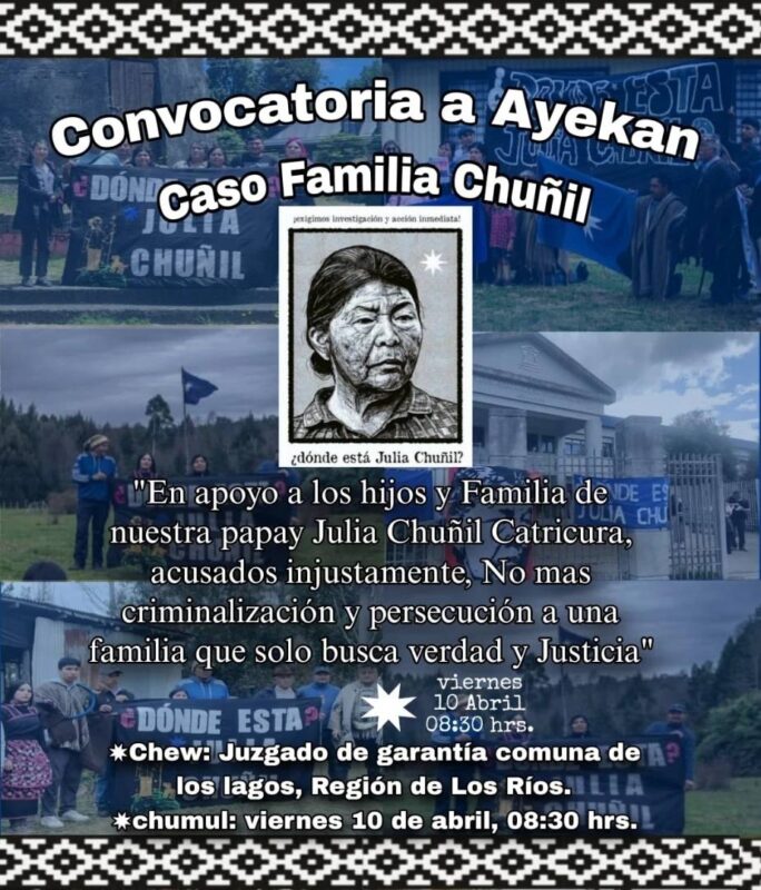 Redes de apoyo de la familia Chuñil, convocan a realizar ayekan para acompañarles en la audiencia de revisión de medidas cautelares, que se llevará a cabo el día viernes 10 de abril a las 8:30 am, en las afueras del juzgado de garantía de la comuna de Los Lagos, región de Los Ríos.